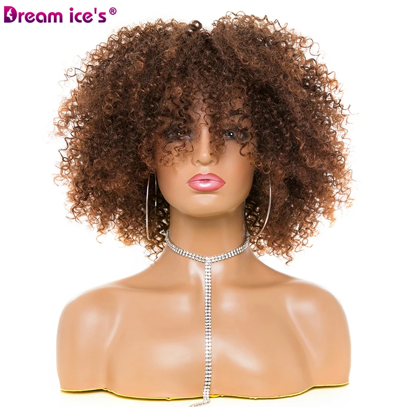 Name: Afro corto rizado pelucas con flequillo para las mujeres negras rubia marrón Cosplay sintético Africana pelucas resistente al calor Dreamice