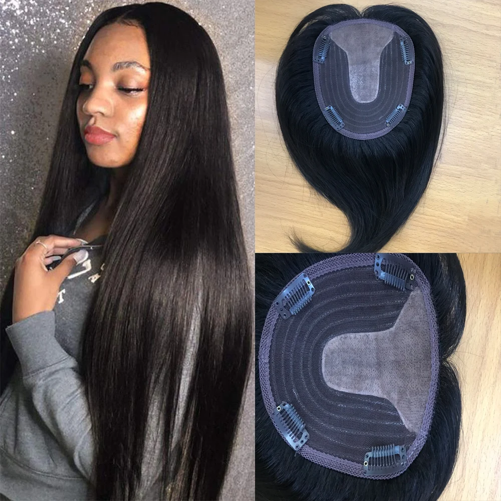 Name: Peluca de pelo liso Natural para mujer, pelo humano con parte superior de seda hecha a máquina, pinzas de corona para cabello fino